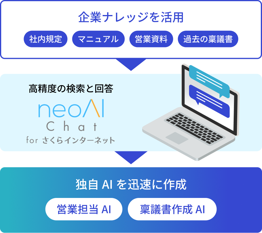 neoAI Chat for さくらインターネットは、さくらインターネットが提供する高火力サービスを基盤とした、 企業専用のエンタープライズ向けAIチャットサービスです。