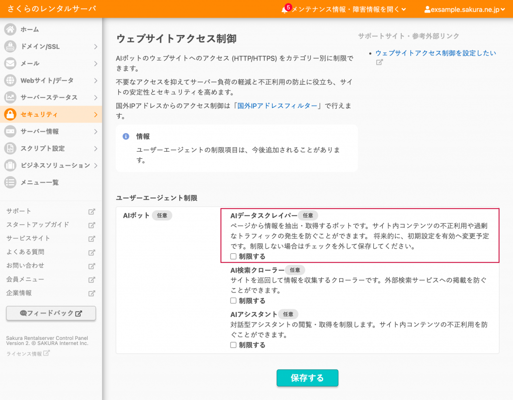 ・「AIデータスクレイパー」は、お客さまのコンテンツへの負荷軽減を目的として、2026年3月17日(火)以降、設定が未実施※の場合は自動的に有効化されます。有効化を希望されない場合は、2026年3月16日(月)までに、コントロールパネルの設定画面にて「制限する」のチェックを外して設定を保存していただくようお願いいたします。なお、自動的に有効化された後も、コントロールパネルからいつでも有効・無効を切り替えることができます。