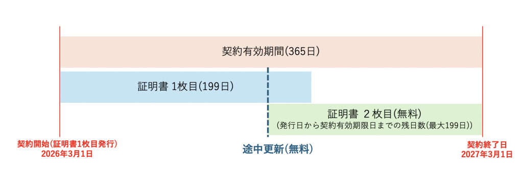 ・2026年2月25日(水)以降に再発行を依頼され、依頼時点での有効期限が 200日以上残っている場合は、再発行後の証明書の有効期限は「再発行日から199日後」となります。