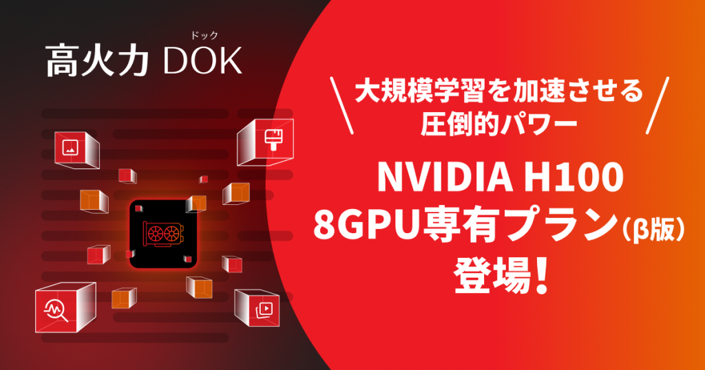 さくらインターネット、生成AI向けクラウドサービス「高火力」のコンテナーシリーズ「高火力 DOK」より、1秒から利用できる「NVIDIA H100プラン(β版)」を提供開始(2024年8月27日発表)