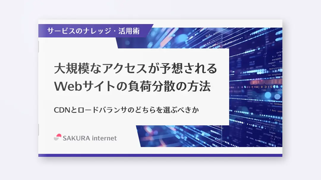 本資料では、大規模なアクセスが予想されるWebサイトを運用される方向けに、負荷分散の方法を説明する資料です。CDNとロードバランサのどちらを選ぶべきかお悩みのお客様におすすめの資料となっております。ユースケース別にさくらインターネットのサービスで実現する構成例もご用意しています。